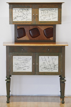 Stepback Cupboard Six Views of the Hozu River 2009 pigment stained cherry, maple, central intarsia panel, painted and silkscreened door panels |