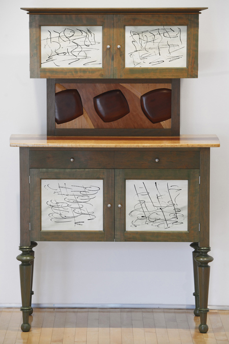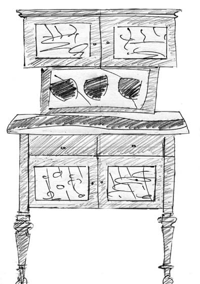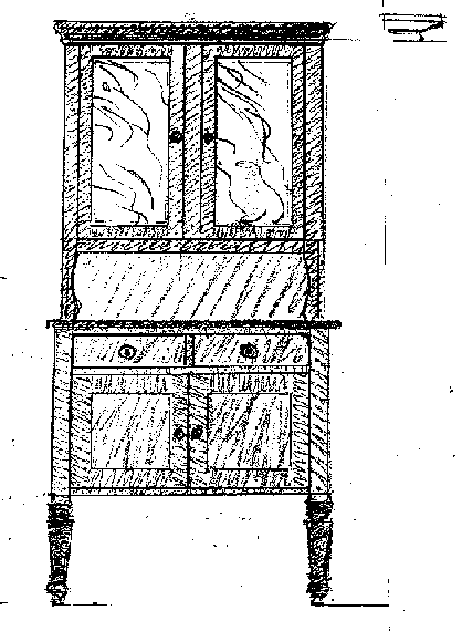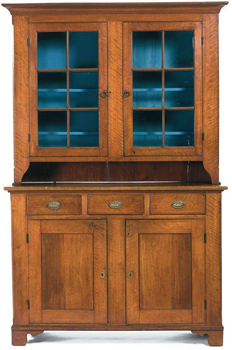 Door panels to stepback cupboard, reverse painting on glass with gilt.