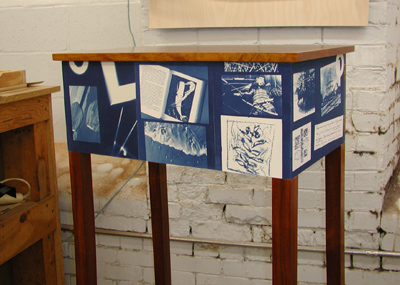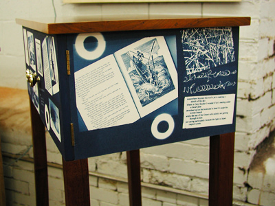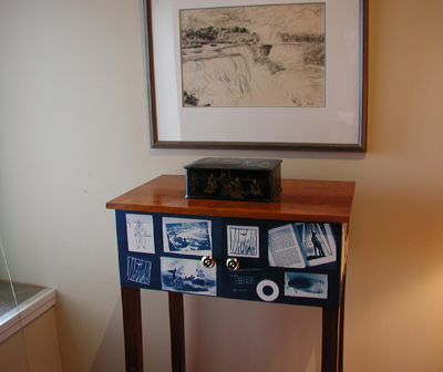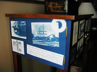 This cabinet combines strategies and techniques from furniture making traditions, graphic design and photo processes to tell a visual story. The story is about two men - John Manjiro in Japan and Herman Melville in New Bedford, Ma., who set off on sea voyages within 3 days of each other in January of 1841, crossing the oceans in opposite directions , Melville toward Japan and Manjiro eventually to Fairhaven (New Bedford). Both men played their parts in the story of the opening of Japan to the West, the drifting of ideas and cultures carrying through to today, while still smelling the same oceans, hearing the same birds - two men in nature and history. The story is told in an abstract way with the open ended, overlapping, non-linear meanings particular to images, including images of text. The Moby Dick images, for instance, can be read for the actual Rockwell Kent imagery - like the crow's nest, which could be imagined as Melville himself on his first whaling voyage - or as an image representing the book Moby Dick and its place in our histories, all superimposed on a piece of furniture. This seems logical to me, in the logic perhaps of the Japanese tea bowl, because a cabinet is made to hold things, a special cabinet made with great care and purpose is made to hold special things, so this cabinet could be said to hold ideas and stories on its surface through purpose made images of my own - drawings and photos made from nature locally - as well as appropriated images from various sources.