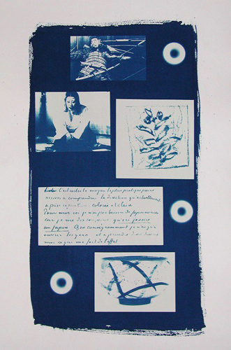 Besides the narrative content about Melville, John Manjiro and New Bedford harbor, the piece is a visual proposal. The graphics are about diagonals - all the exciting things you might do with diagonals. There's a rhythm of positive/negative. There's a grid structure -the artsy scrapbook, or the graphic novel - japanized by the off centered, asymmetrical, Mikado-like, coy cocking of the head in the placement of the images. The blue and white cyanotype prints open up another cliched image of Japan. There's an attempt to balance the simple sweeping form - the box on stand - and the slight chaos of the floating graphic strategy. You could say there's some appropriation of images, though that might be a very 80's way of seeing it. I prefer to think of it, in the age of Facebook, as a way to affect the great digital image flow.